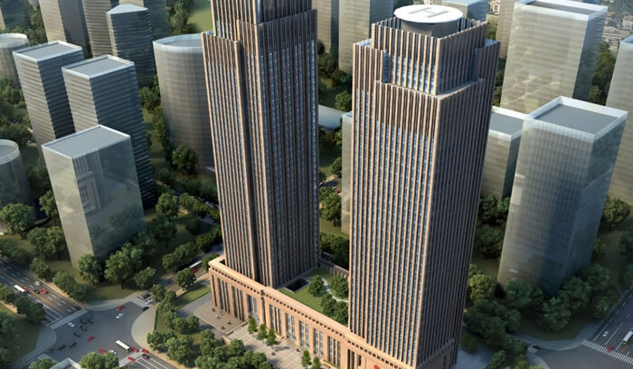 方案采用两栋超高层建筑结合布局的方式,形成具有雕塑感与标识性的简洁办公群体,建筑采用“金色号外”的设计母题,采用暖灰的色调,既与报业集团的社会认知相吻合,又以艺术形象的完美体现,昭示集团的蓬勃发展。双塔楼以现代风格设计,强调简洁的体量组合和流畅的线条及建筑的整体性,并突出现代的材料和现代的构造技术,同时注重建筑的整体空间关系;根据总体布置、建筑规模、平面形式、使用功能,采用现代设计表现形式,以满足不同方向视觉均较丰富、完整,同城市环境具有良好的视觉关系。立面上采用暖灰色石材和玻璃幕墙的外立面处理手法,竖向线条赋予建筑典雅大气的整体效果。